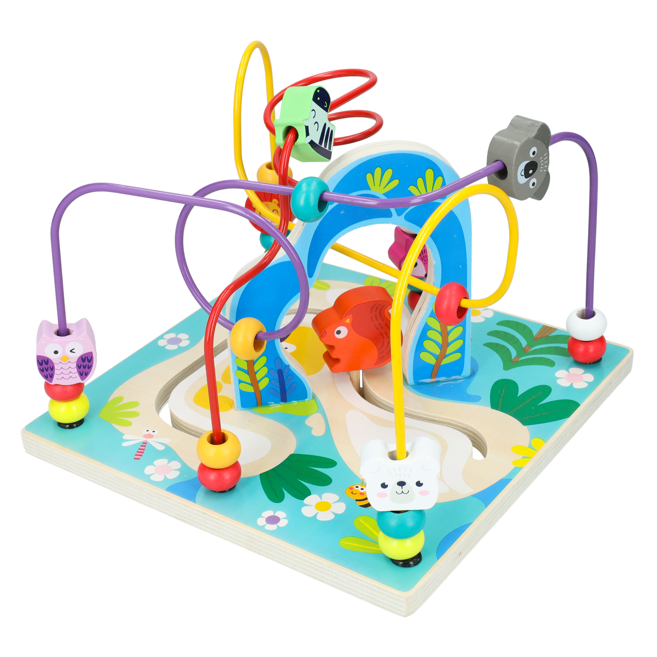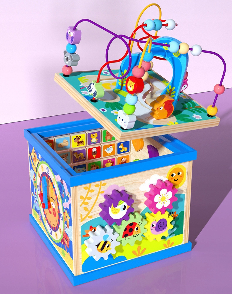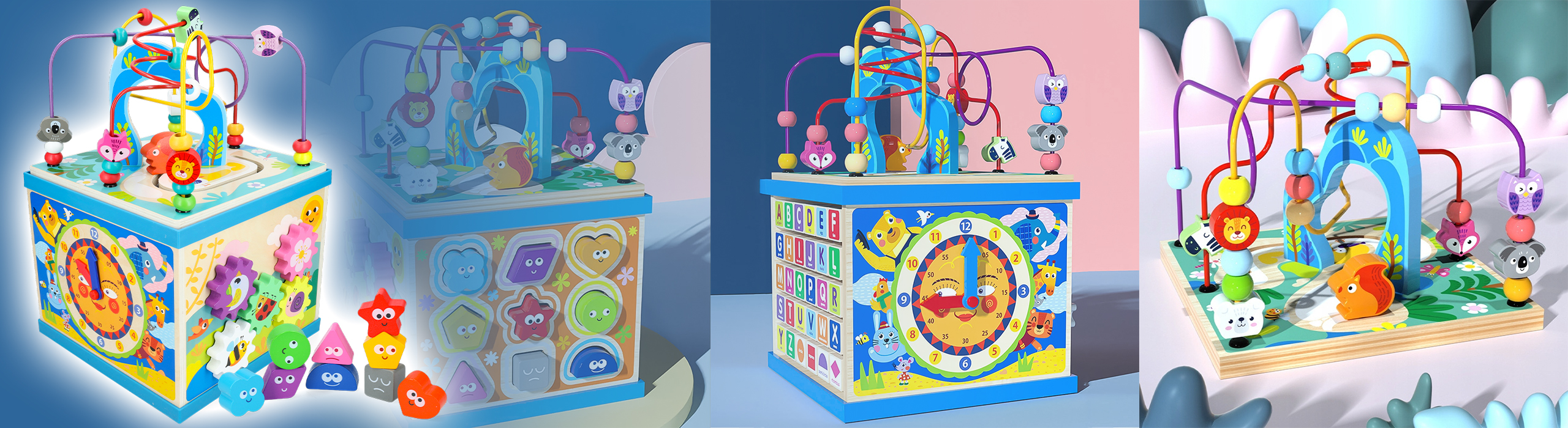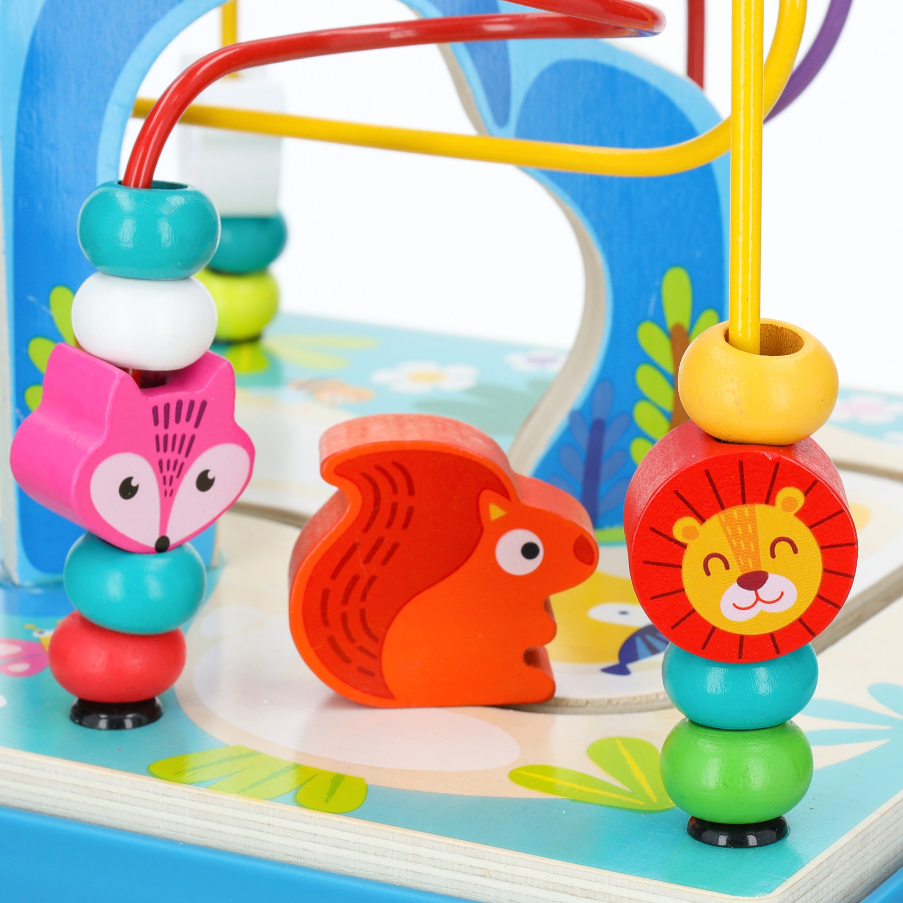 Na górnej części kostki znajduje się tor z koralikami przesuwanymi po kolorowych drutach. Przemieszczanie koralików poprawia koordynację ręka-oko oraz zdolności manualne, a przy tym dostarcza dziecku dużo radości i pozwala na kreatywną zabawę.