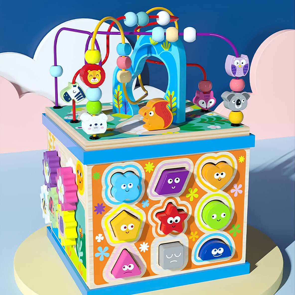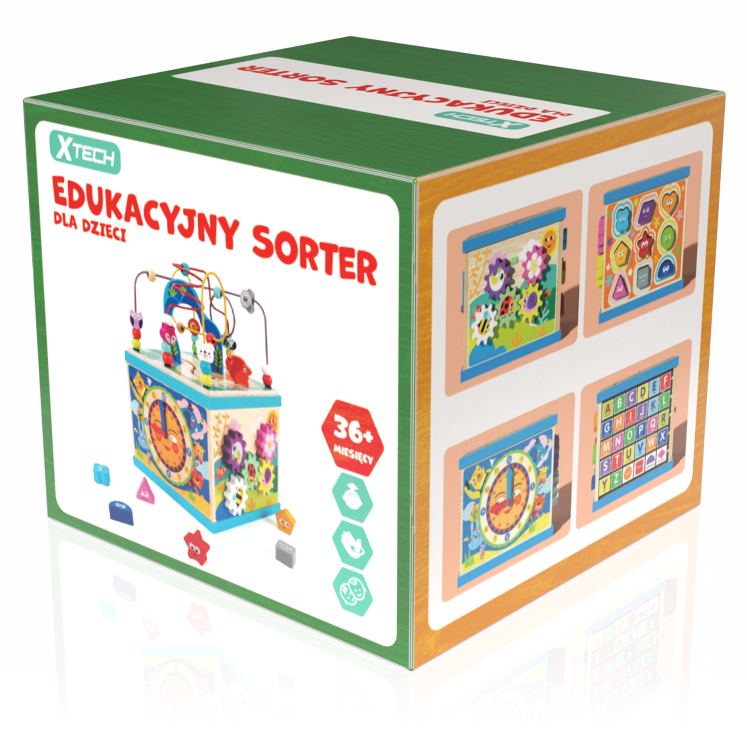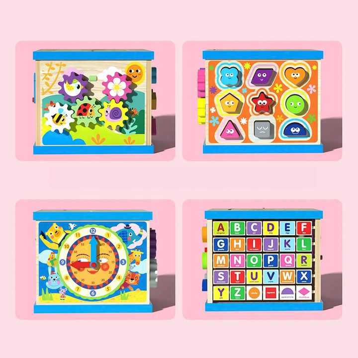 Na jednej ze ścian kostki znajduje się kolorowy sorter z różnorodnymi kształtami: gwiazdką, sercem, kwiatkiem i innymi figurami. Każdy kształt ma przyjazną twarz, co sprawia, że dziecko z radością dopasowuje elementy do odpowiednich otworów. Ta zabawa rozwija umiejętności poznawcze, uczy rozpoznawania form oraz ćwiczy precyzję.
