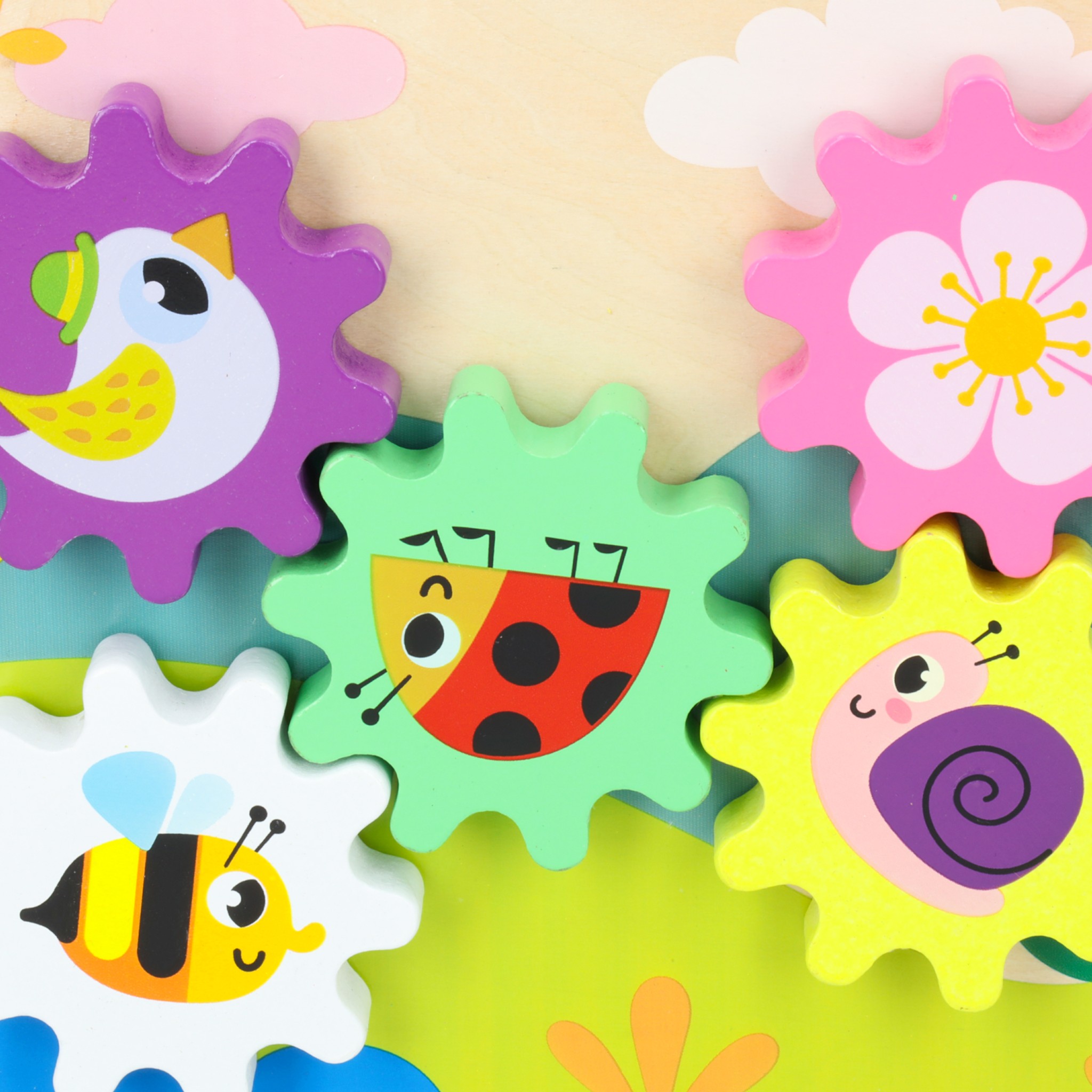 Boczne ściany kostki wyposażone są w obracające się elementy, które imitują przekładnie. Dziecko może manipulować kolorowymi kółkami, zębatkami i obserwować, jak elementy współpracują ze sobą. Ta funkcja rozwija logiczne myślenie i uczy o zależnościach między elementami.
