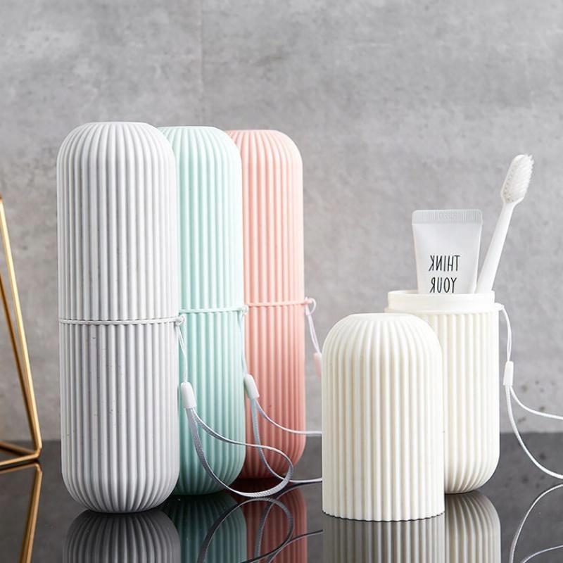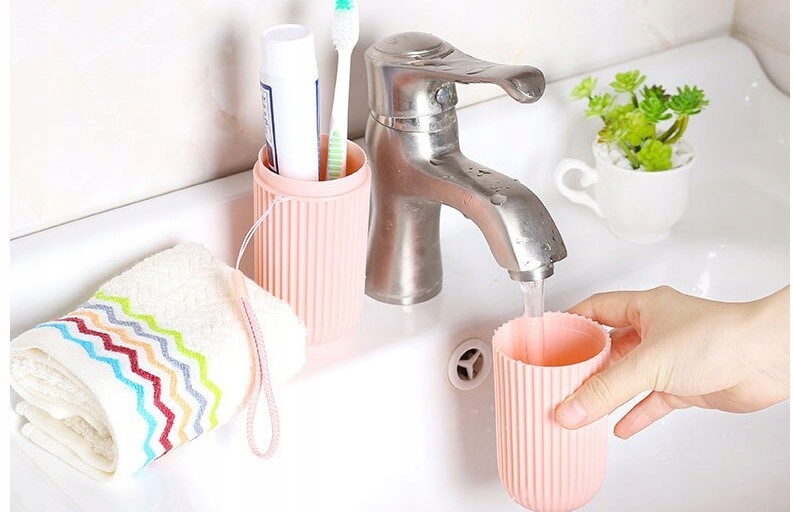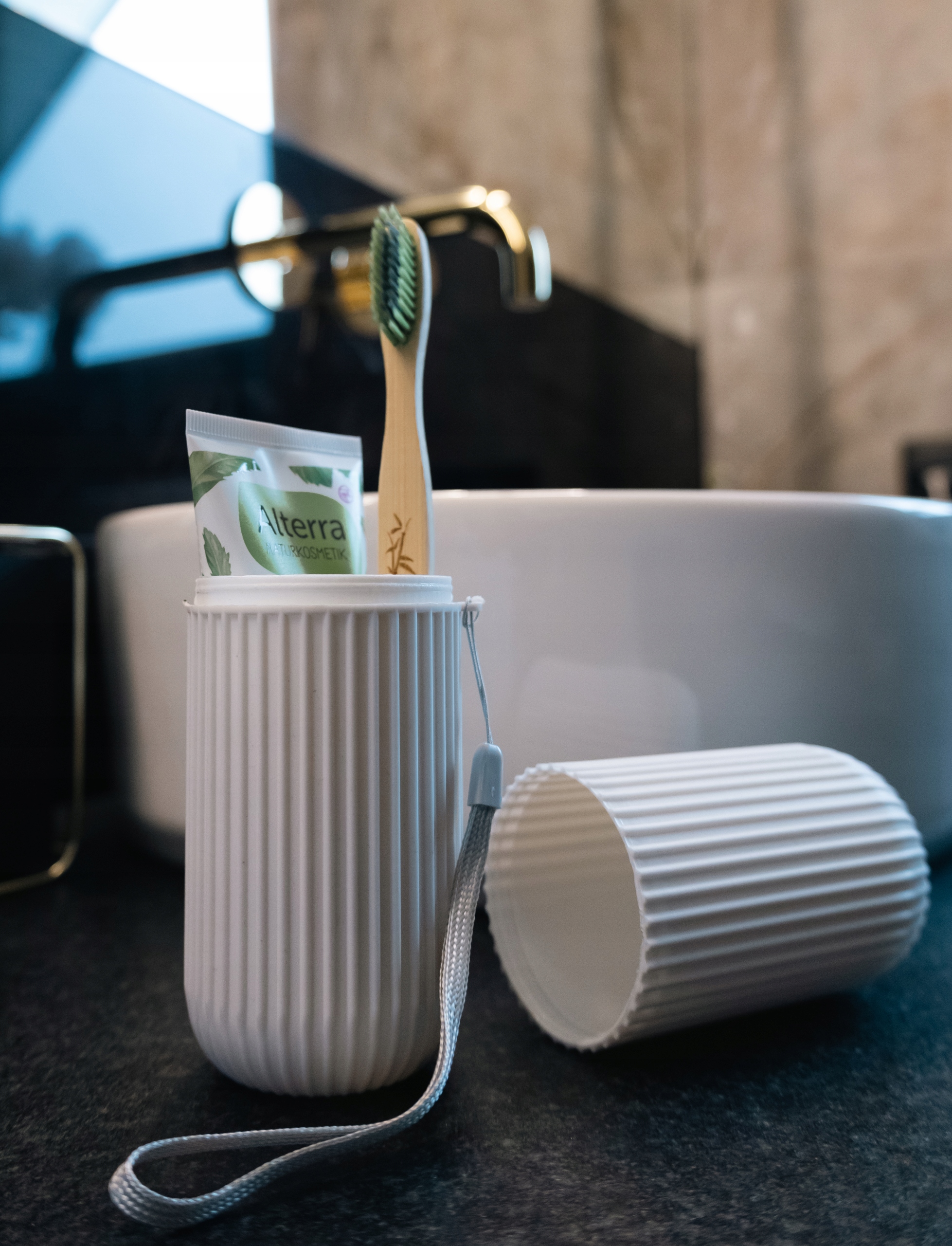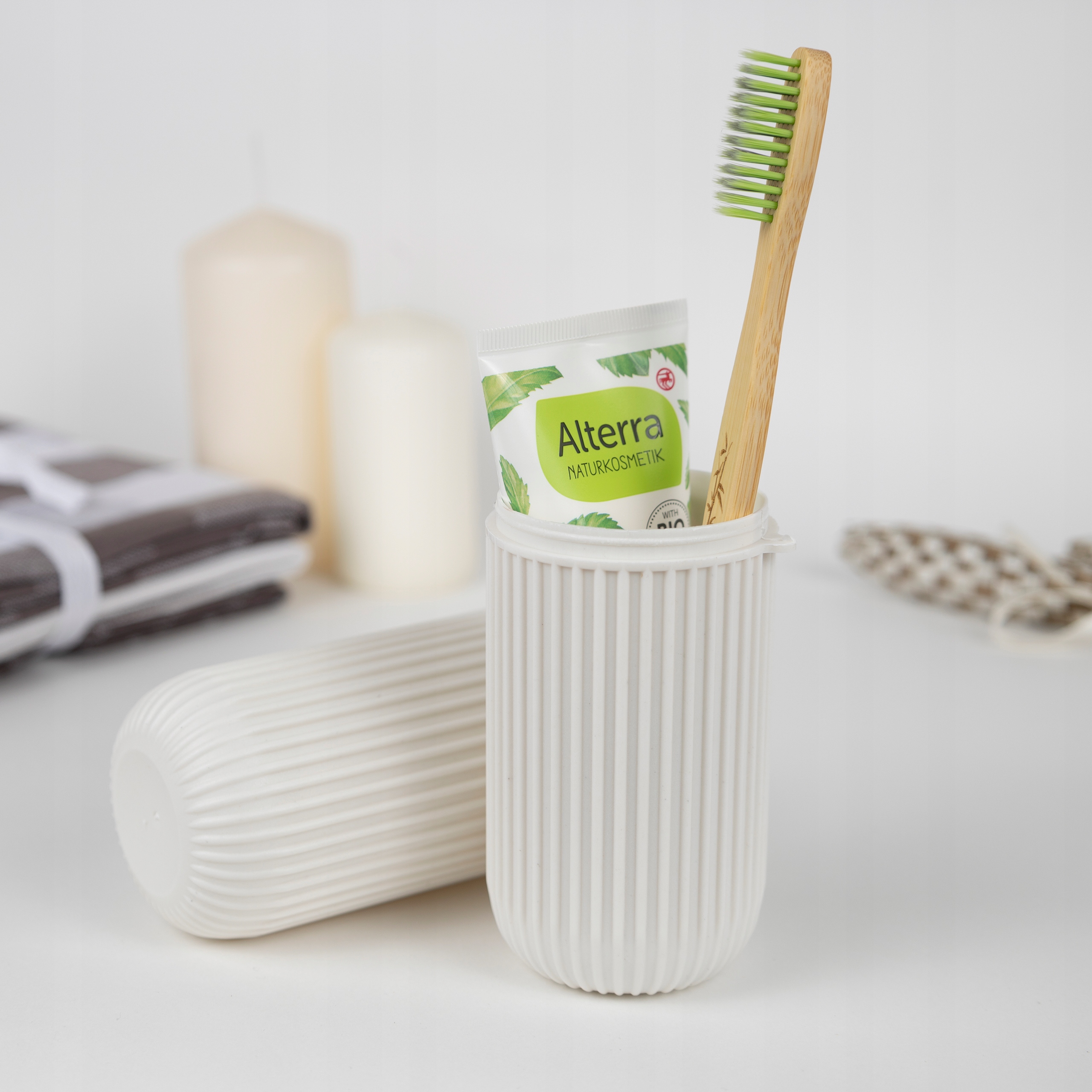 Poza funkcją ochronną przyborów higienicznych, część nakrywki pełni także rolę kubka do płukania jamy ustnej po umyciu zębów.
