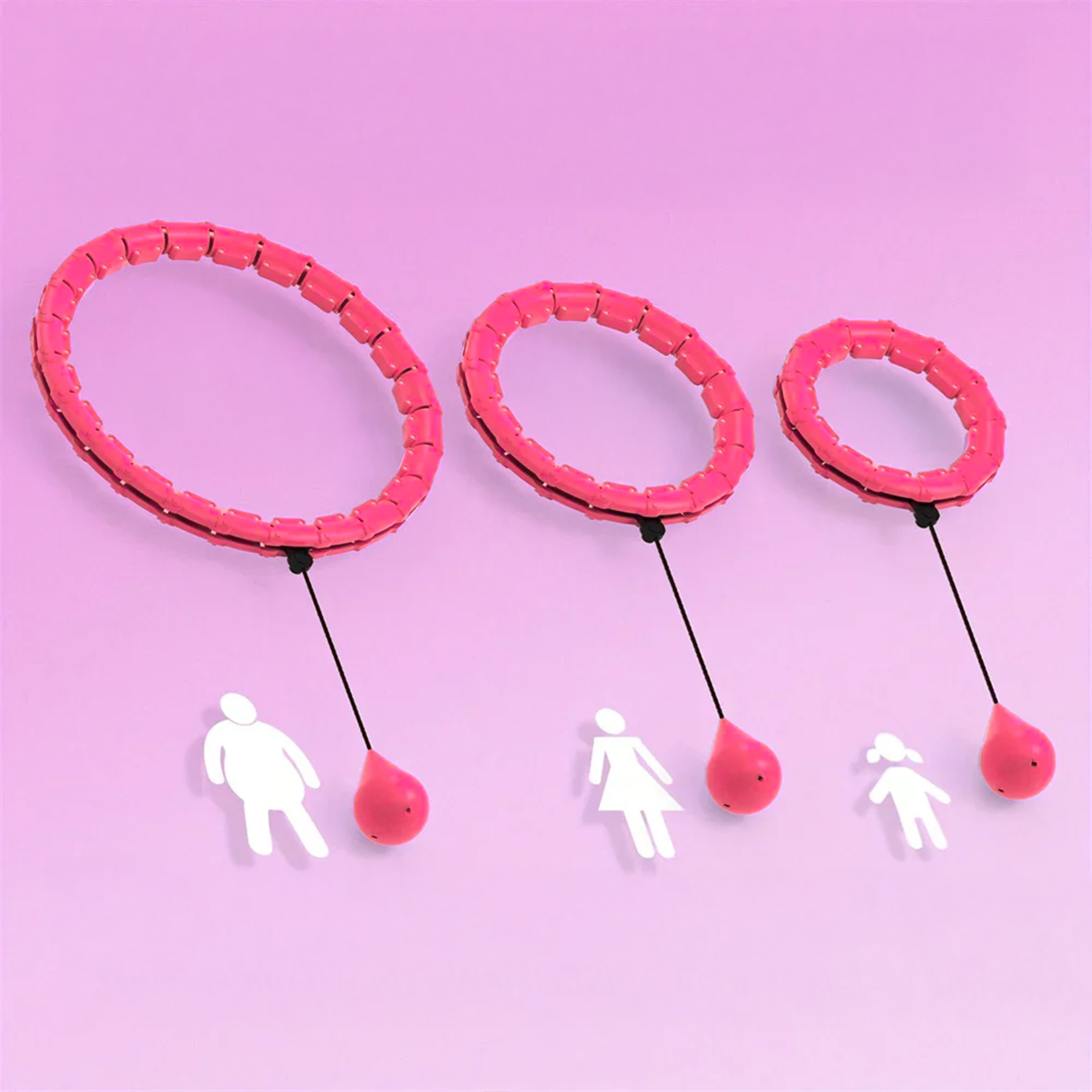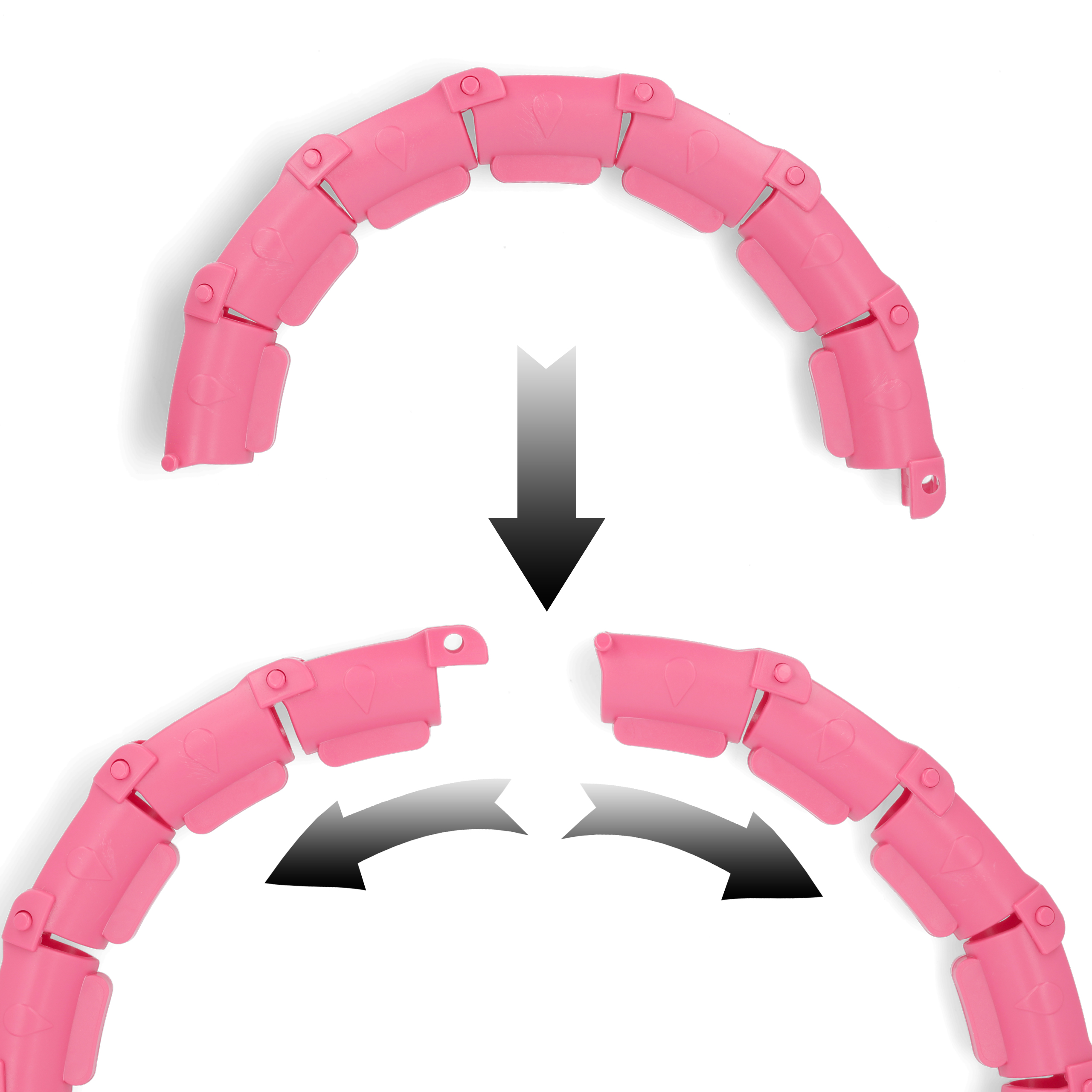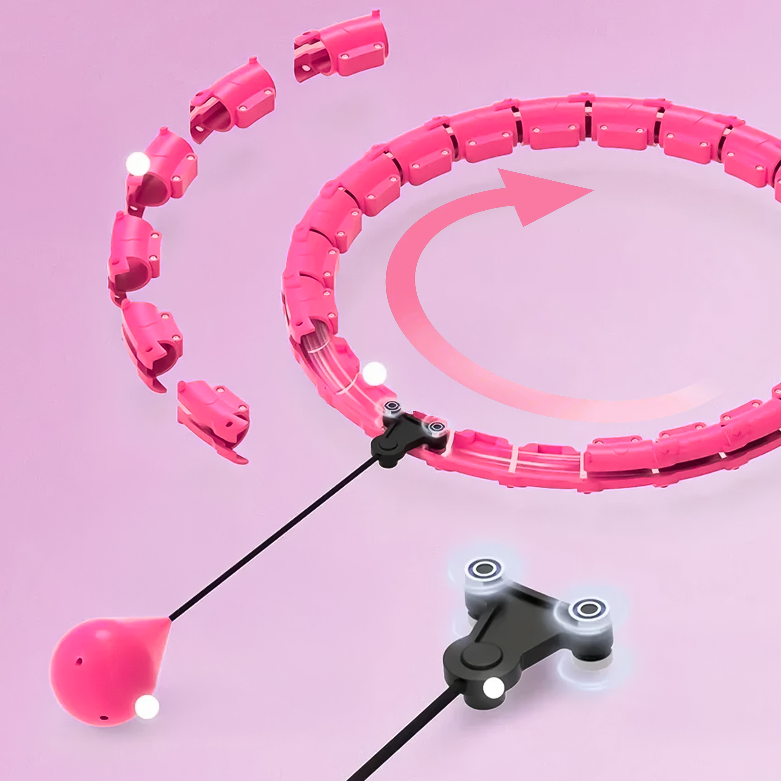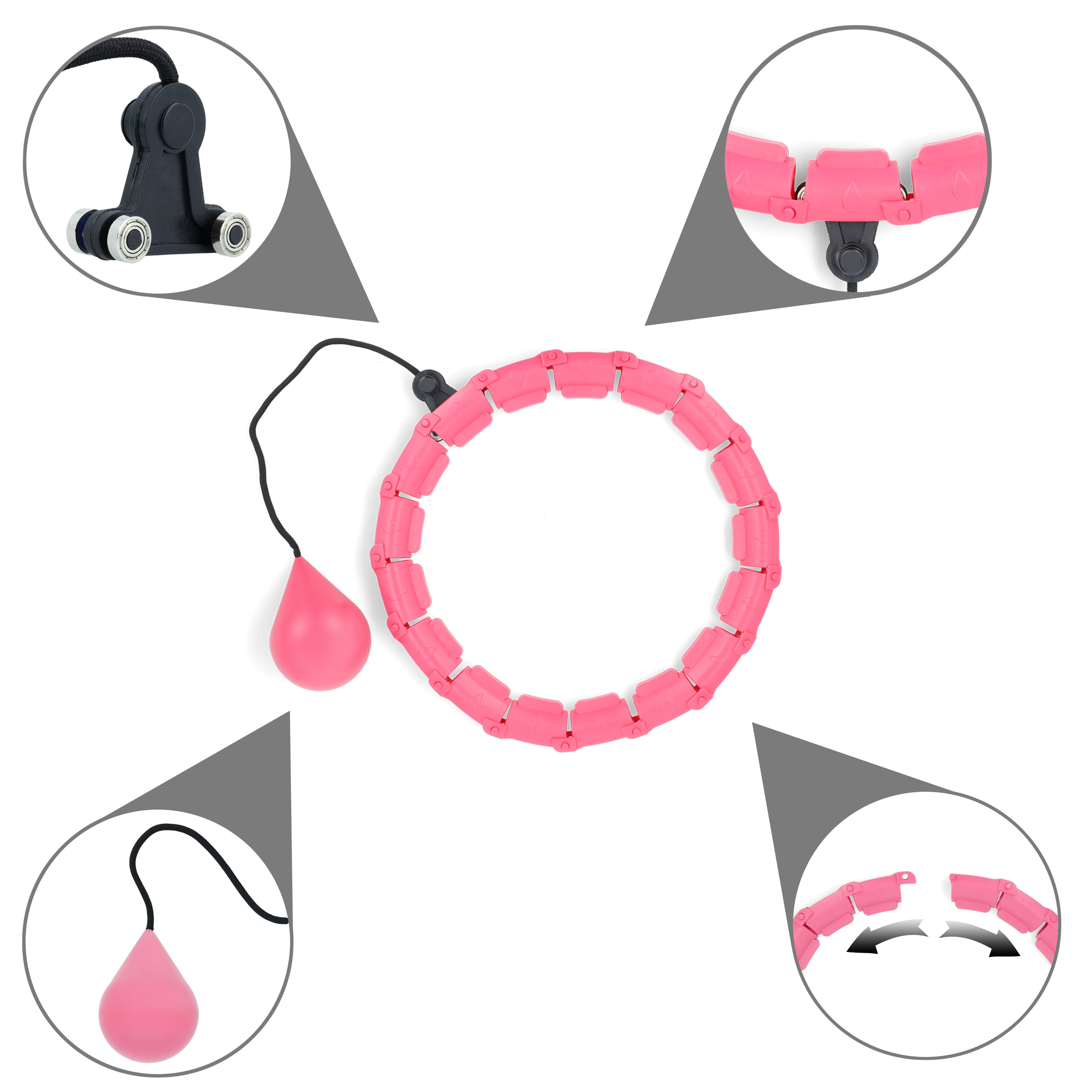 - Segmentowa konstrukcja – regulowana średnica Obręcz składa się z kilku segmentów, które można w łatwy sposób łączyć i rozłączać. Pozwala to dopasować rozmiar hula hopu do talii użytkownika, dzięki czemu trening jest bardziej ergonomiczny i komfortowy.