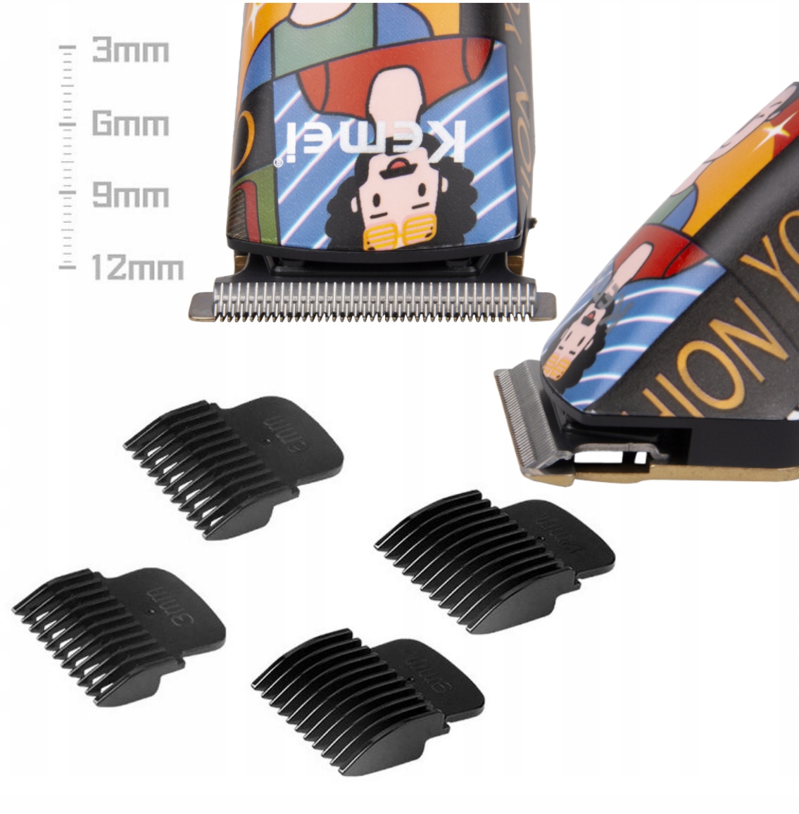 - Dostępne są 4 końcówki prowadące ( 3 mm / 6 mm / 9 mm / 12 mm), które przycinają długość i ułatwiają układanie wszystkich rodzajów włosów.