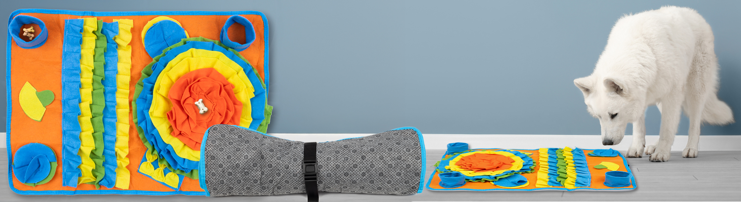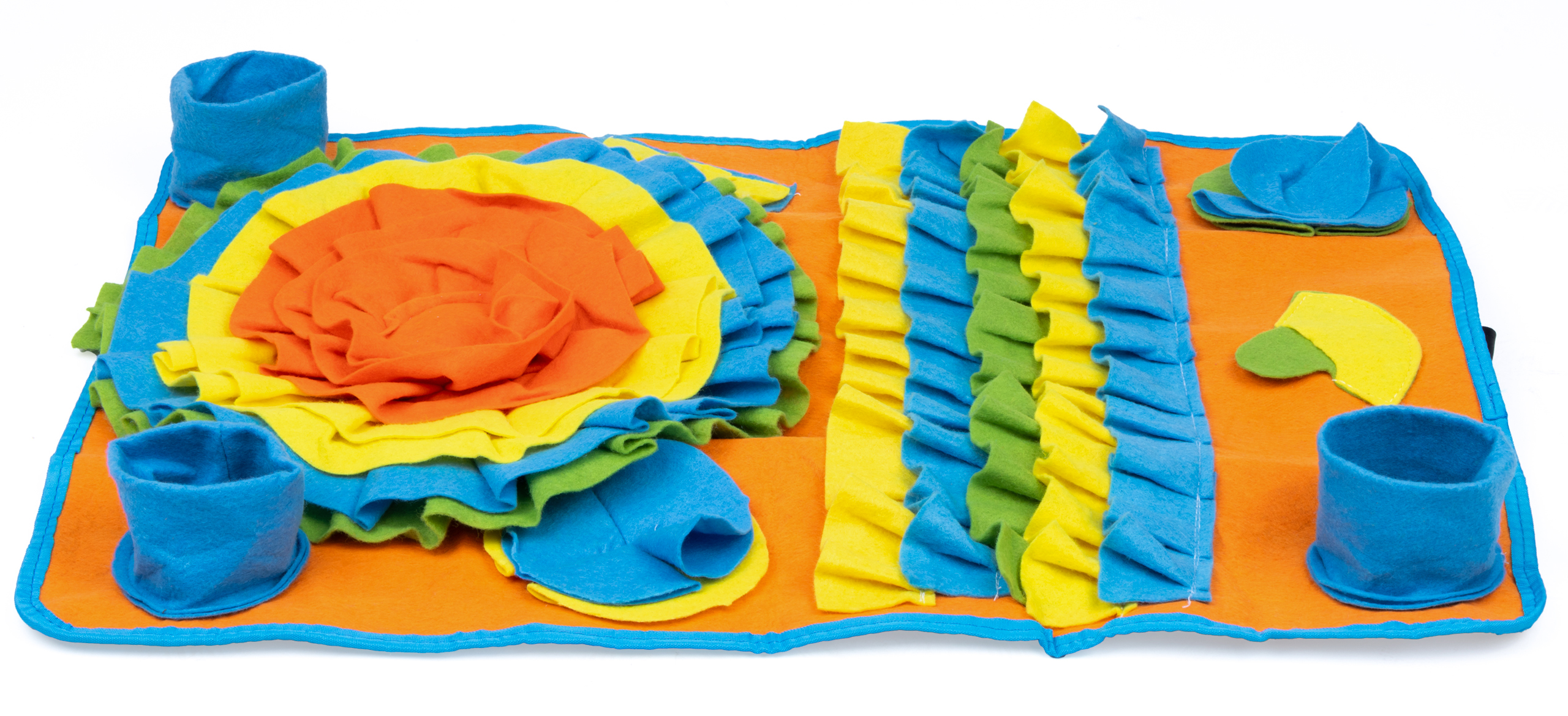 - Rozwijanie zmysłu węchu – Twoje zwierzę ćwiczy nos, szukając smakołyków ukrytych w macie.