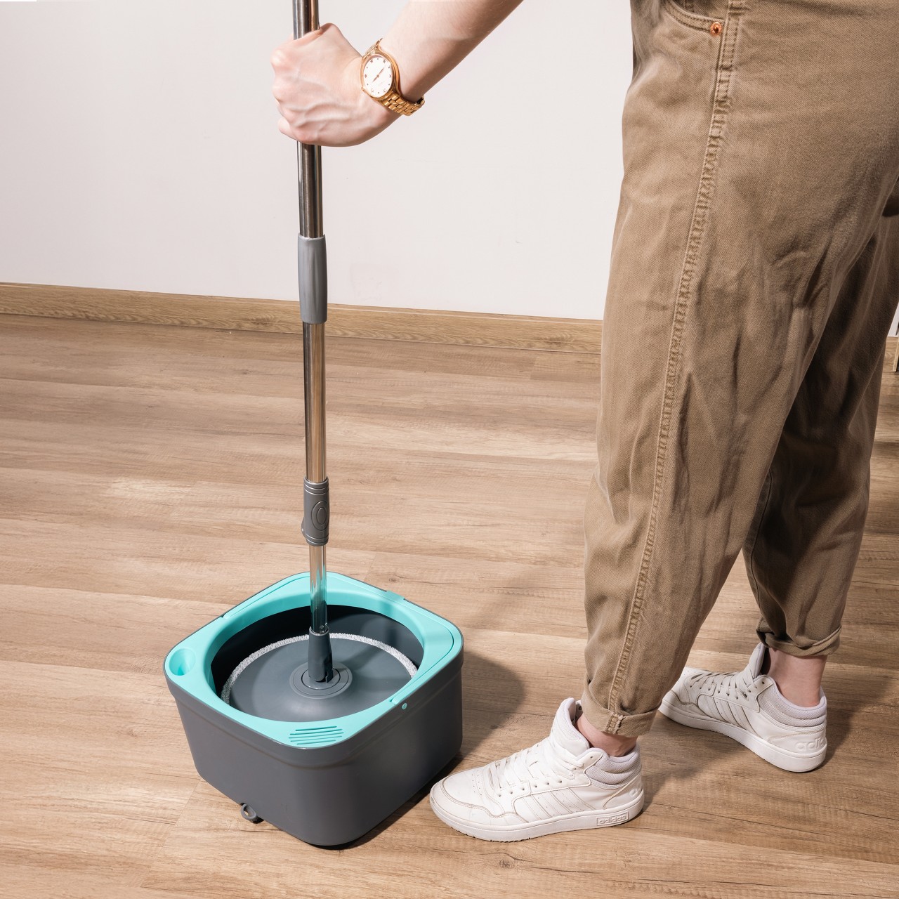 Wiadro zostało wyposażone w funkcję automatycznego płukania oraz wirowania końcówki – wystarczy kilka ruchów w górę i w dół, aby dokładnie wypłukać i odsączyć mop bez kontaktu rąk z brudną wodą.