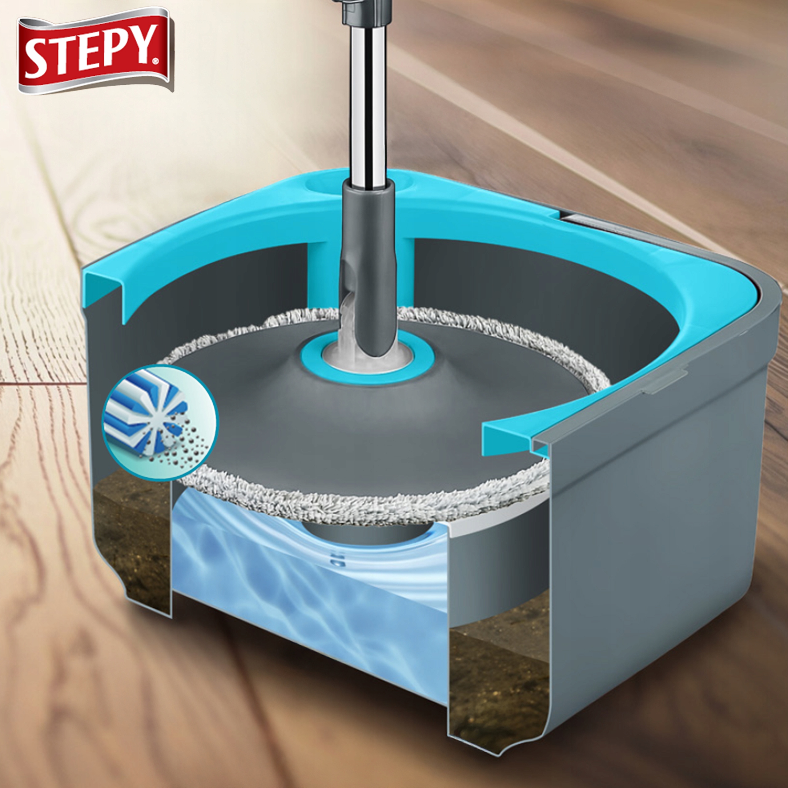 - Zaprojektowany z myślą o maksymalnej wygodzie i skuteczności, Mop Obrotowy STEPY All Clean to innowacyjne rozwiązanie do codziennego sprzątania każdego rodzaju podłóg.