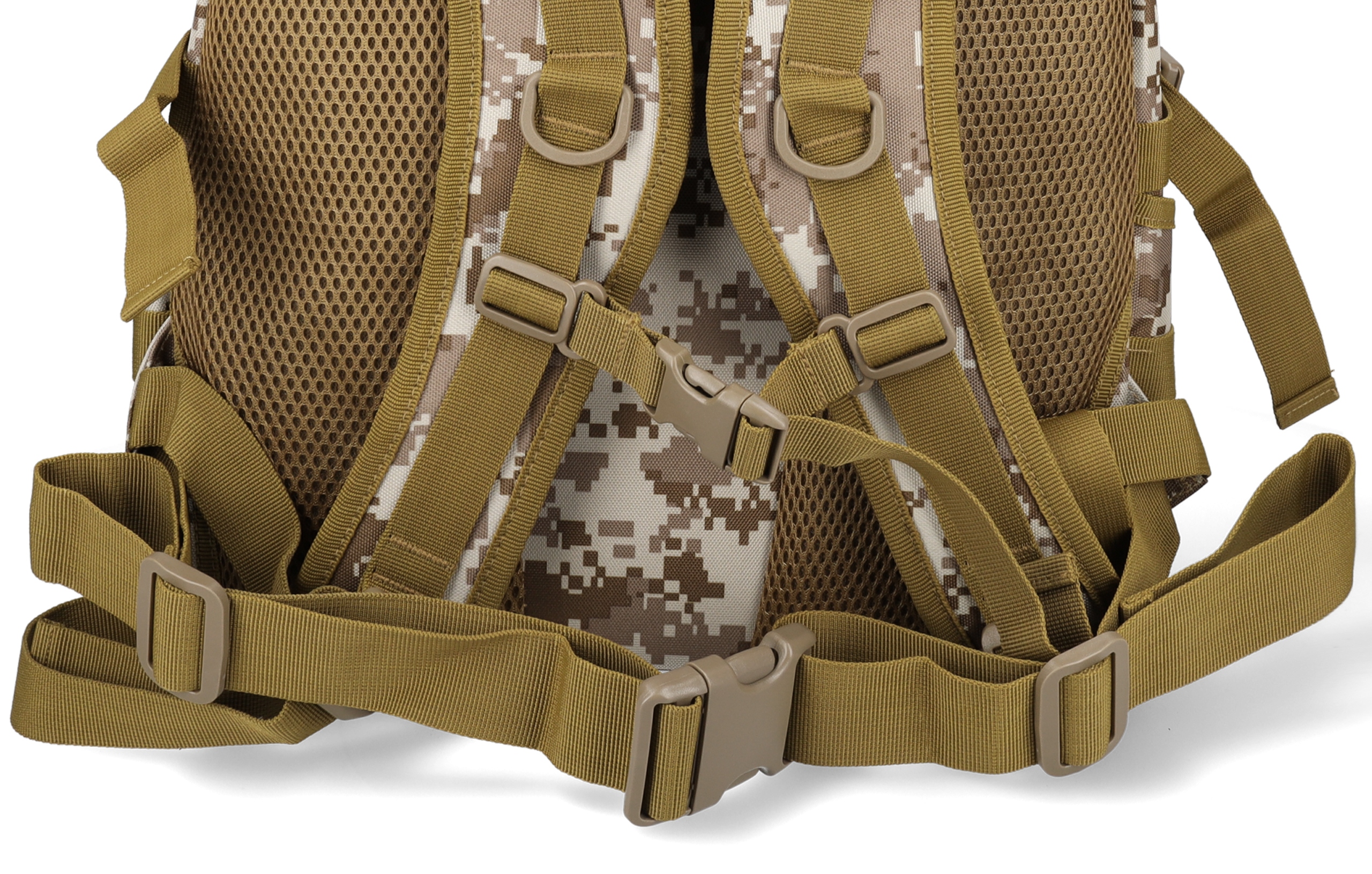 Z tyłu plecak jest usztywniany i pokryty pianką, posiada taśmę piersiową oraz pas biodrowy, dzięki czemu zapewni prawidłową posturę ciała oraz wygodę noszenia. Szelki zostały wyposażone w D- ringi, na których łatwo można zawiesić dodatkowe przedmioty.