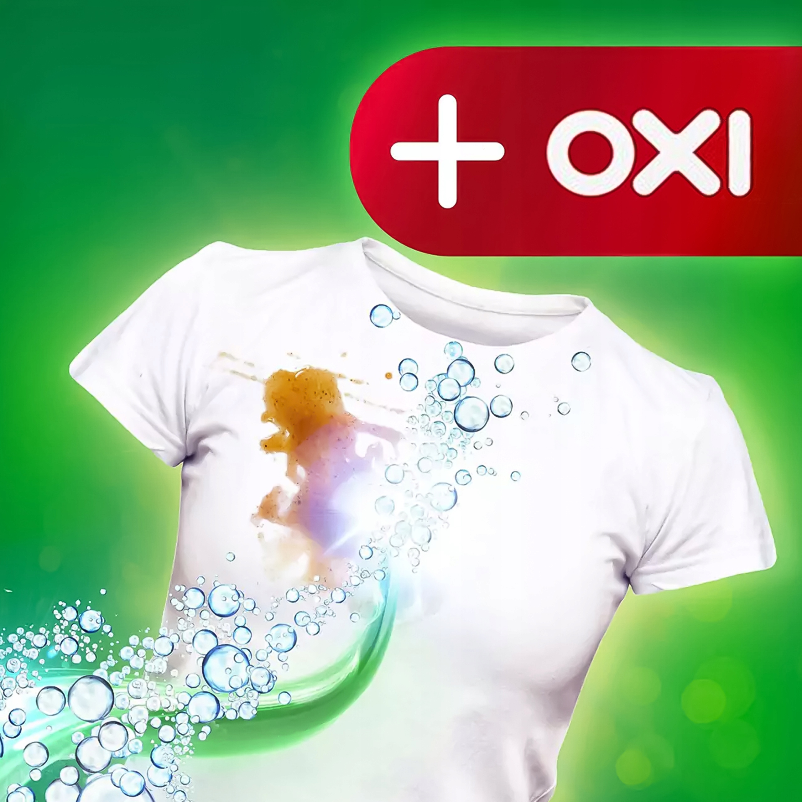 - Formuła OXI – aktywny tlen głęboko wnika we włókna, skutecznie rozpuszczając uporczywe zabrudzenia.