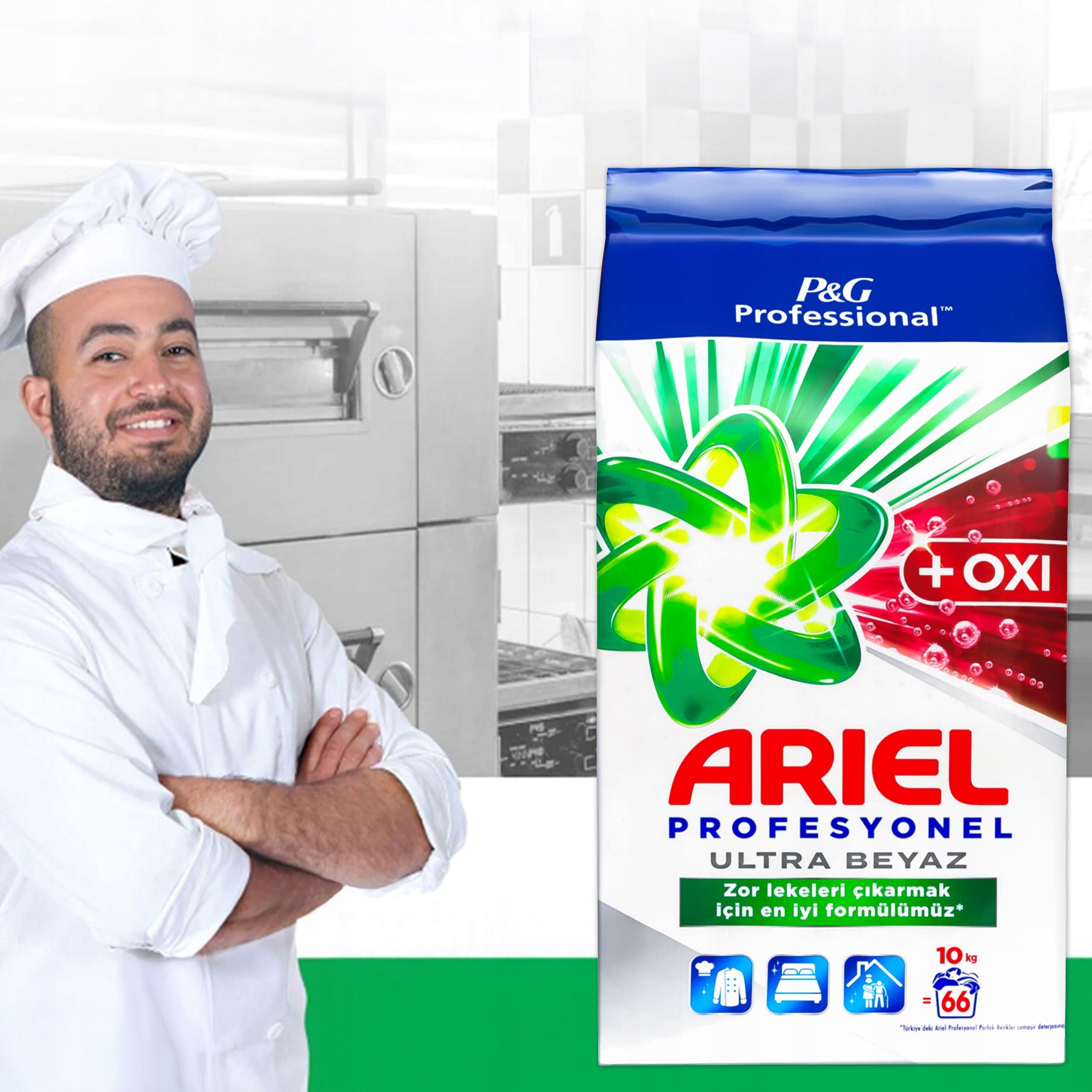 - Ariel Professional Ultra OXI to wysokiej jakości proszek do prania białych tkanin, stworzony z myślą o profesjonalnym zastosowaniu. Dzięki zaawansowanej formule z aktywnym tlenem skutecznie usuwa trudne plamy, nawet w niskich temperaturach.