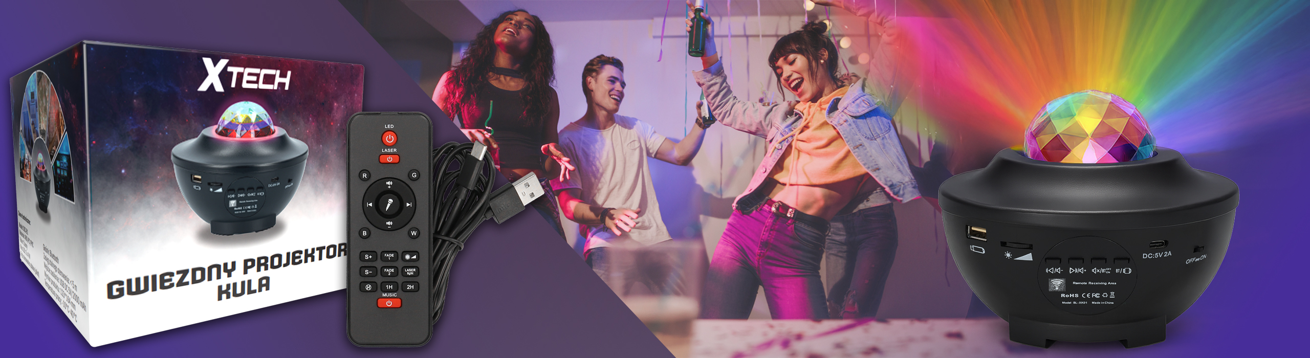 Kolorowa, obracająca się kopuła dyskotekowa rozświetla pomieszczenie efektami przypominającymi kosmos, z opcją zmiany kolorów i trybów świetlnych.