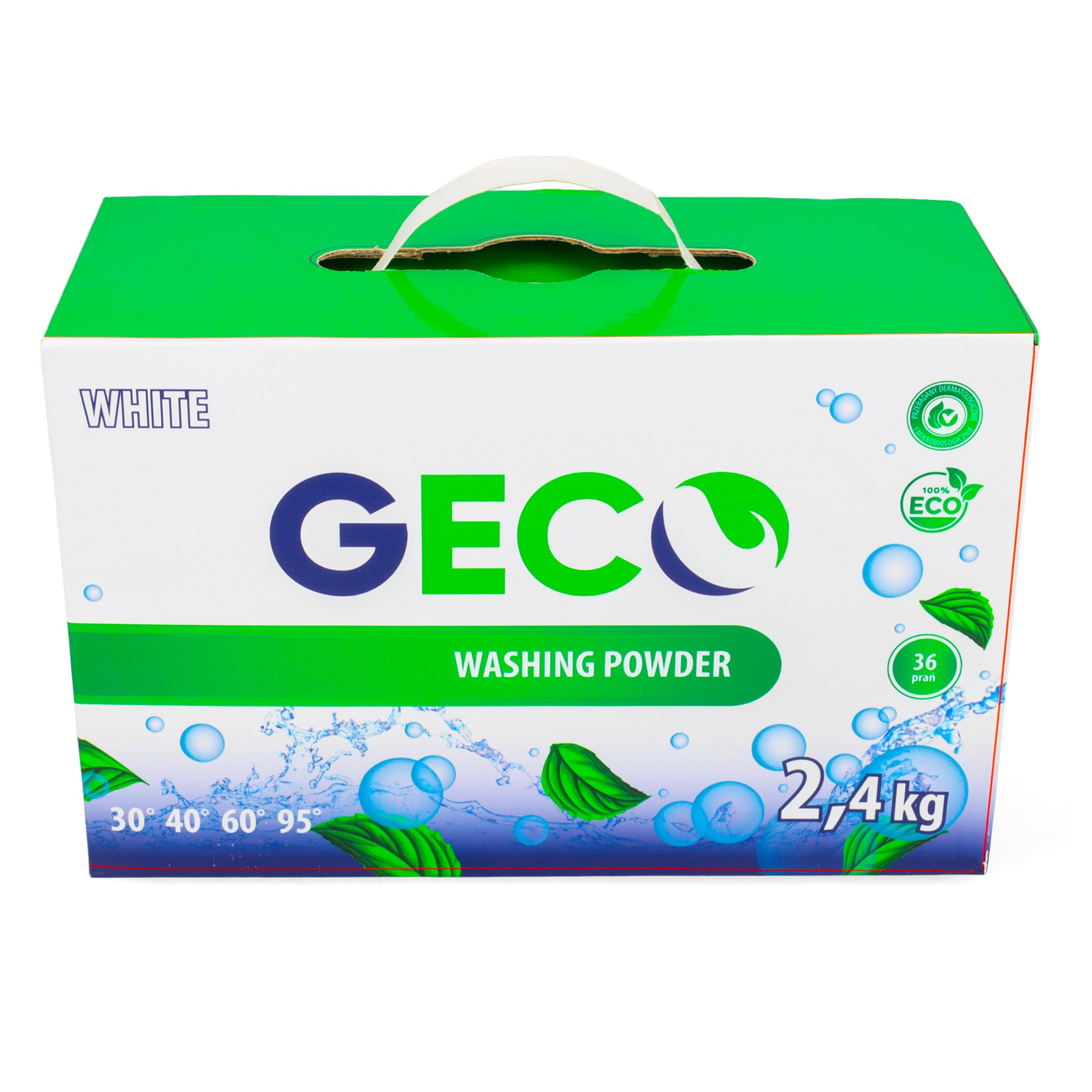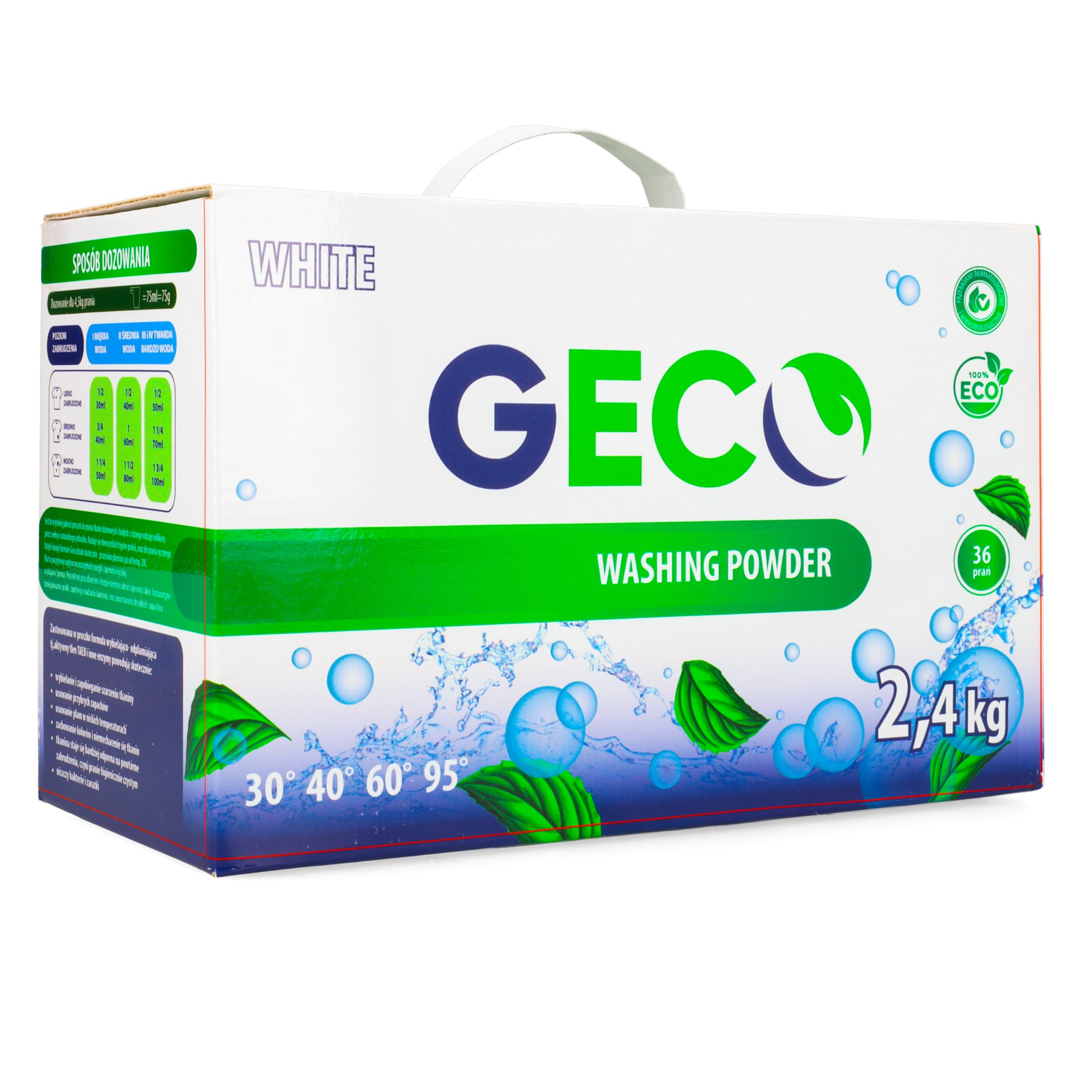 Proszki GECO są produktem Biodegradowalnym – wszelkie zastosowane w formule surowce w produkcji są w pełni biodegradowalne i pochodzą z obszaru Unii Europejskiej. Proszek można stosować w zakresie temperatury od 20°C-90°C. Usuwa skutecznie zabrudzenia organiczne i nieorganiczne w pełni rozpuszczając się w wodzie, w zastosowaniu w pralkach automatycznych, wirnikowych jak i praniu ręcznym.