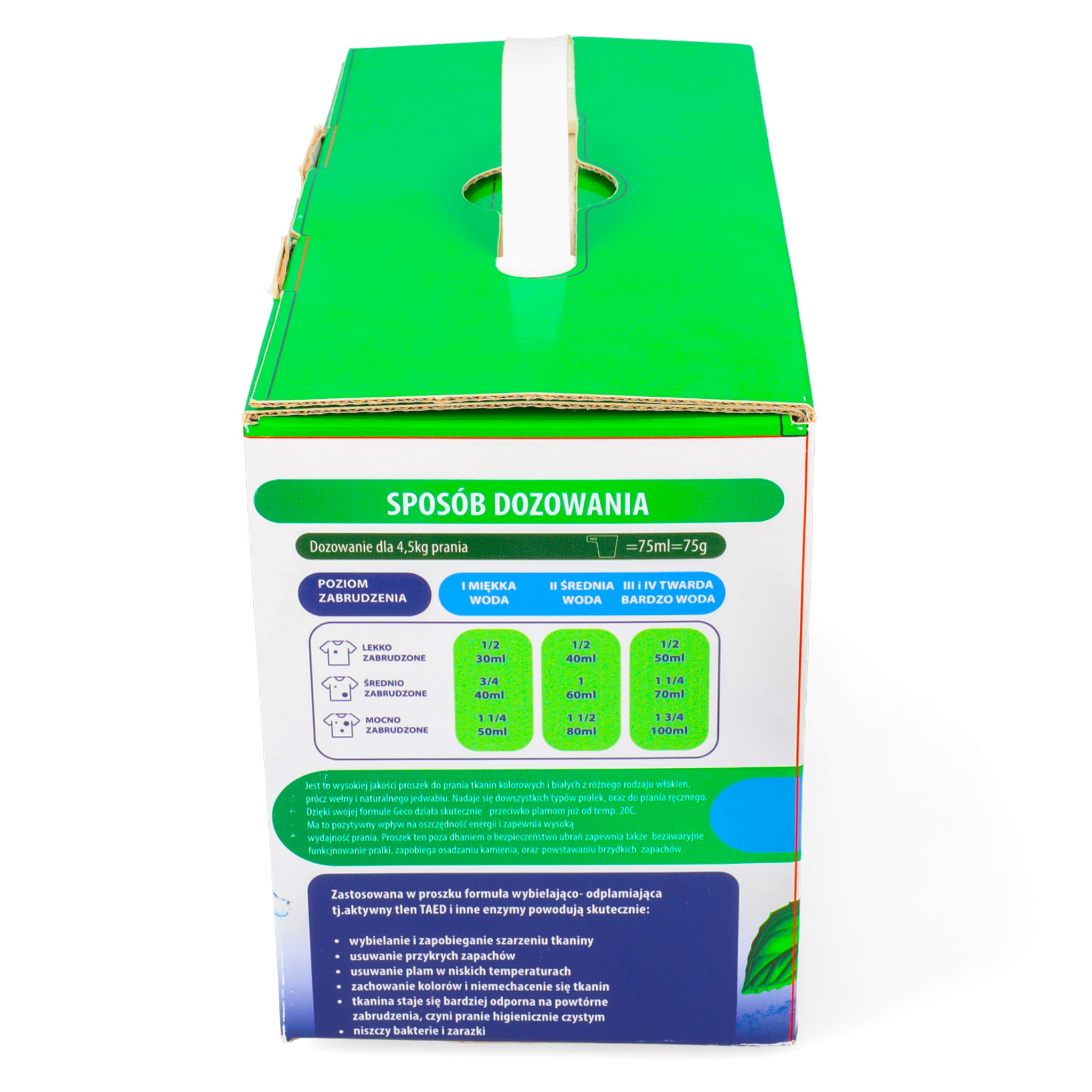 - Ekologiczny proszek do prania marki GECO zaprojektowany z myślą o przyjaznym środowisku.