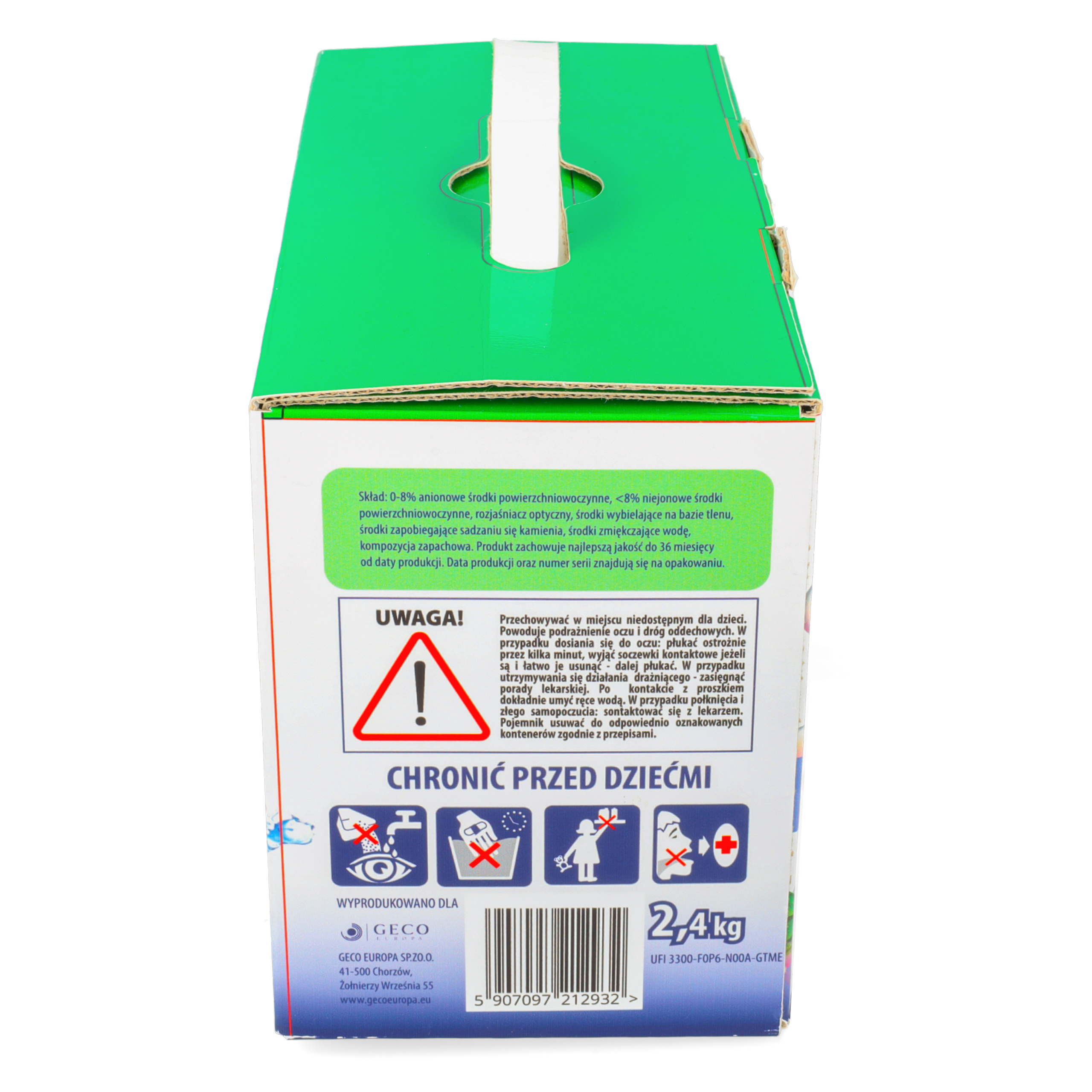 Proszki GECO są produktem Biodegradowalnym – wszelkie zastosowane w formule surowce w produkcji są w pełni biodegradowalne i pochodzą z obszaru Unii Europejskiej. Proszek można stosować w zakresie temperatury od 20°C-90°C. Usuwa skutecznie zabrudzenia organiczne i nieorganiczne w pełni rozpuszczając się w wodzie, w zastosowaniu w pralkach automatycznych, wirnikowych jak i praniu ręcznym.