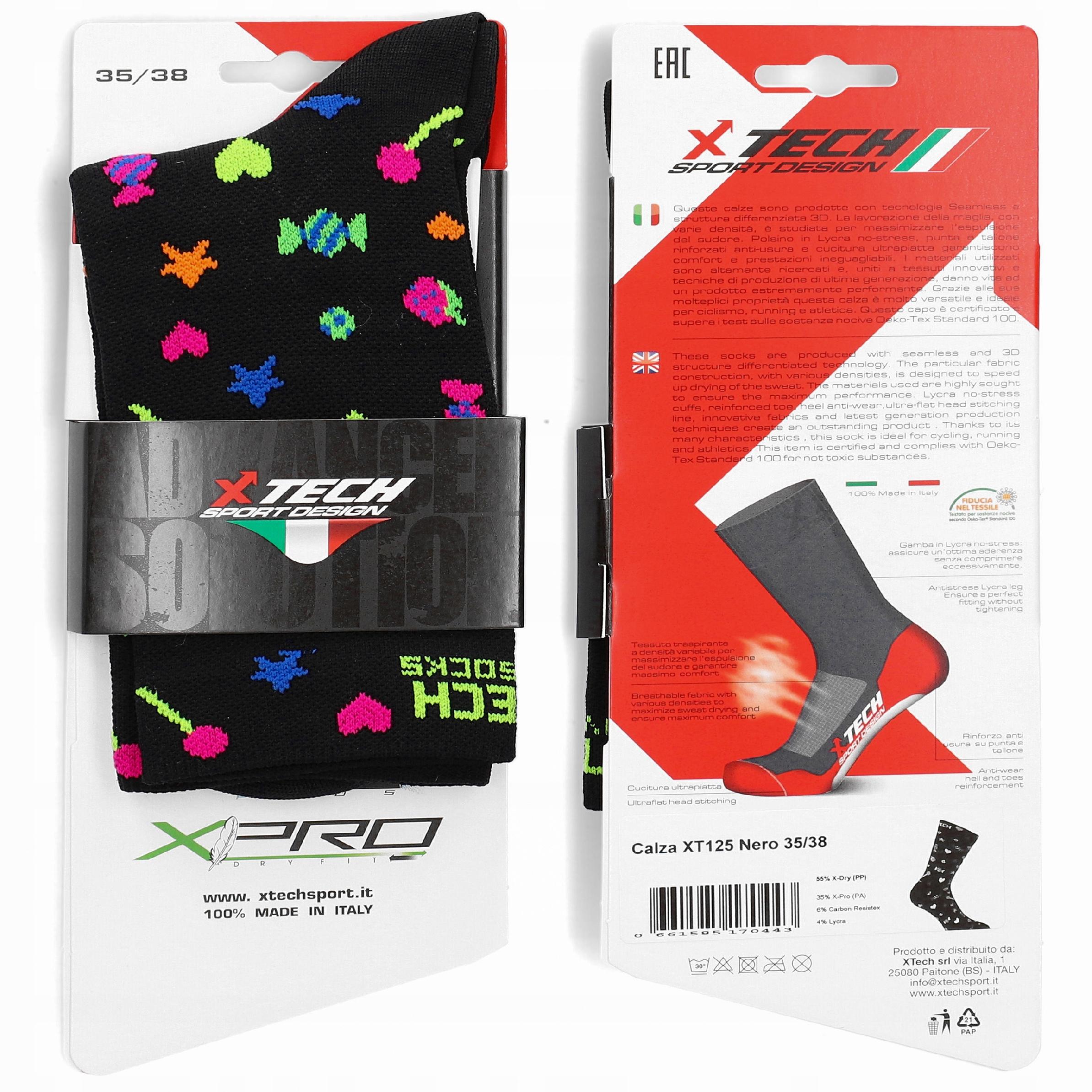 Funkcjonalne skarpety marki XTECH, model XT125, odpowiednie do noszenia w zakresie temperatur od +10°C do +40°C.