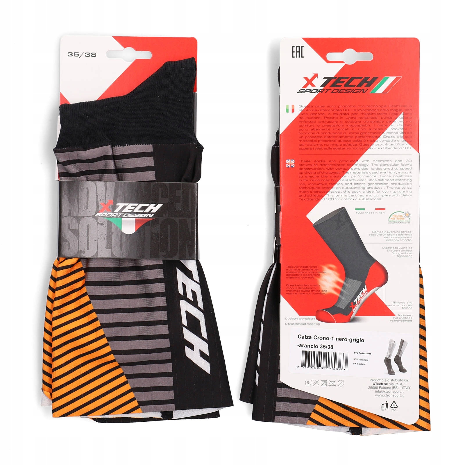 Funkcjonalne skarpety marki XTECH, model Crono-1, odpowiednie do noszenia w zakresie temperatur od +10°C do +40°C.
