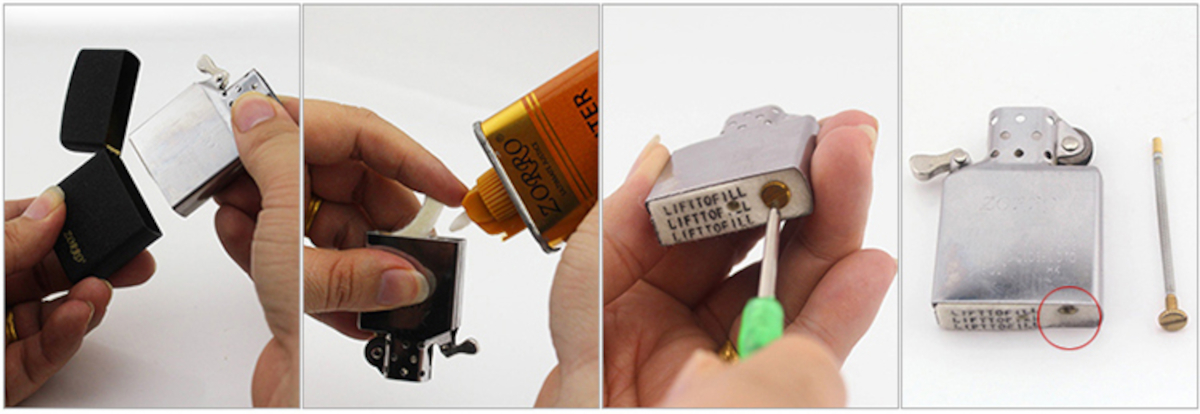 Sprawa jest równie prosta co w przypadku zapalniczek gazowych, jednak do napełnienia będzie potrzebna specjalna benzyna do zapalniczek. W żadnym wypadku nie używaj benzyny ze stacji! Ta jest znacznie bardziej łatwopalna