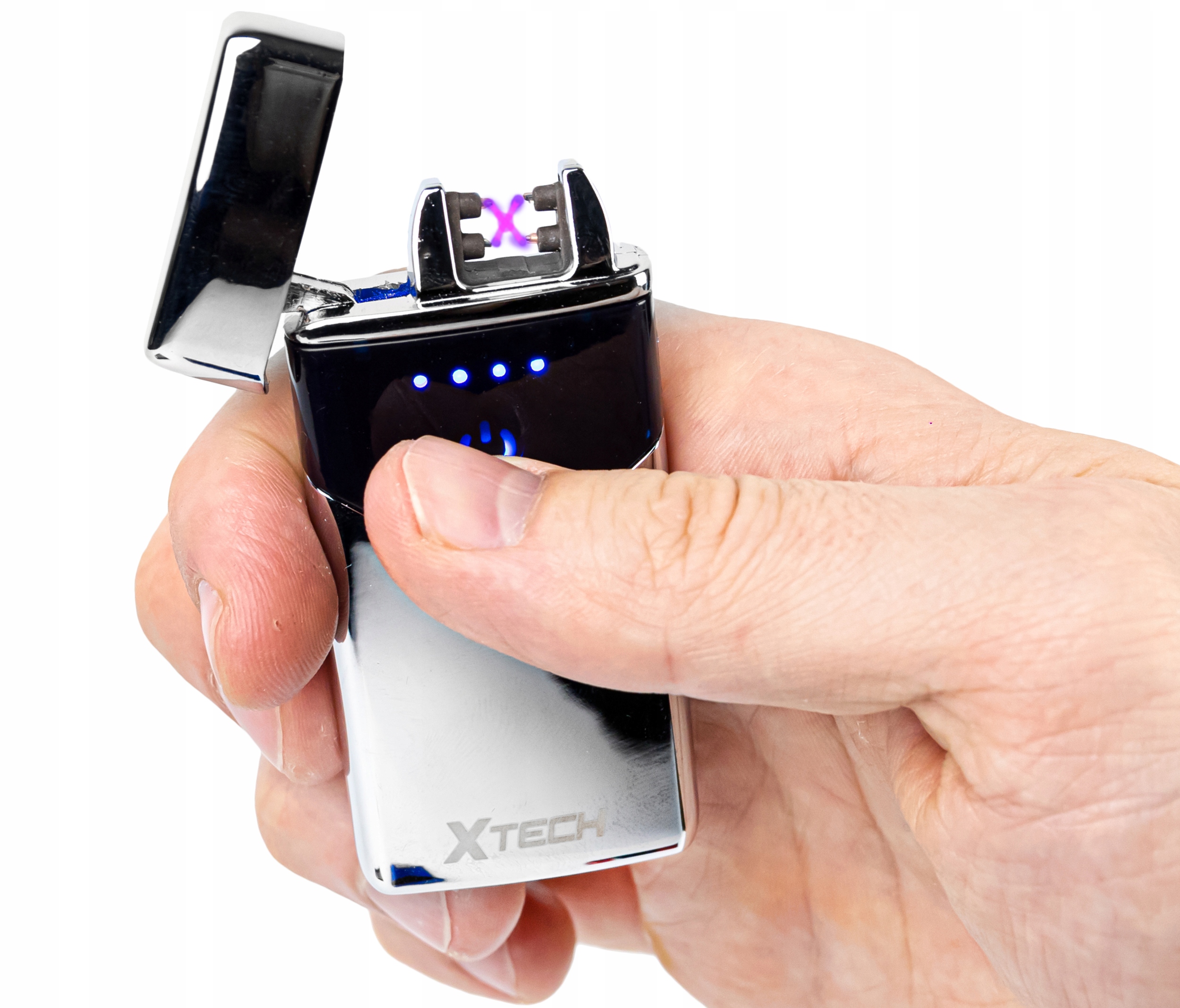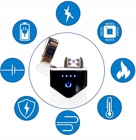 - Przenośna zapalniczka z łukiem świetlnym, ładowana przez USB. Po naładowaniu lub otwarciu osłony bezpieczeństwa zapala się wskaźnik naładowania baterii.