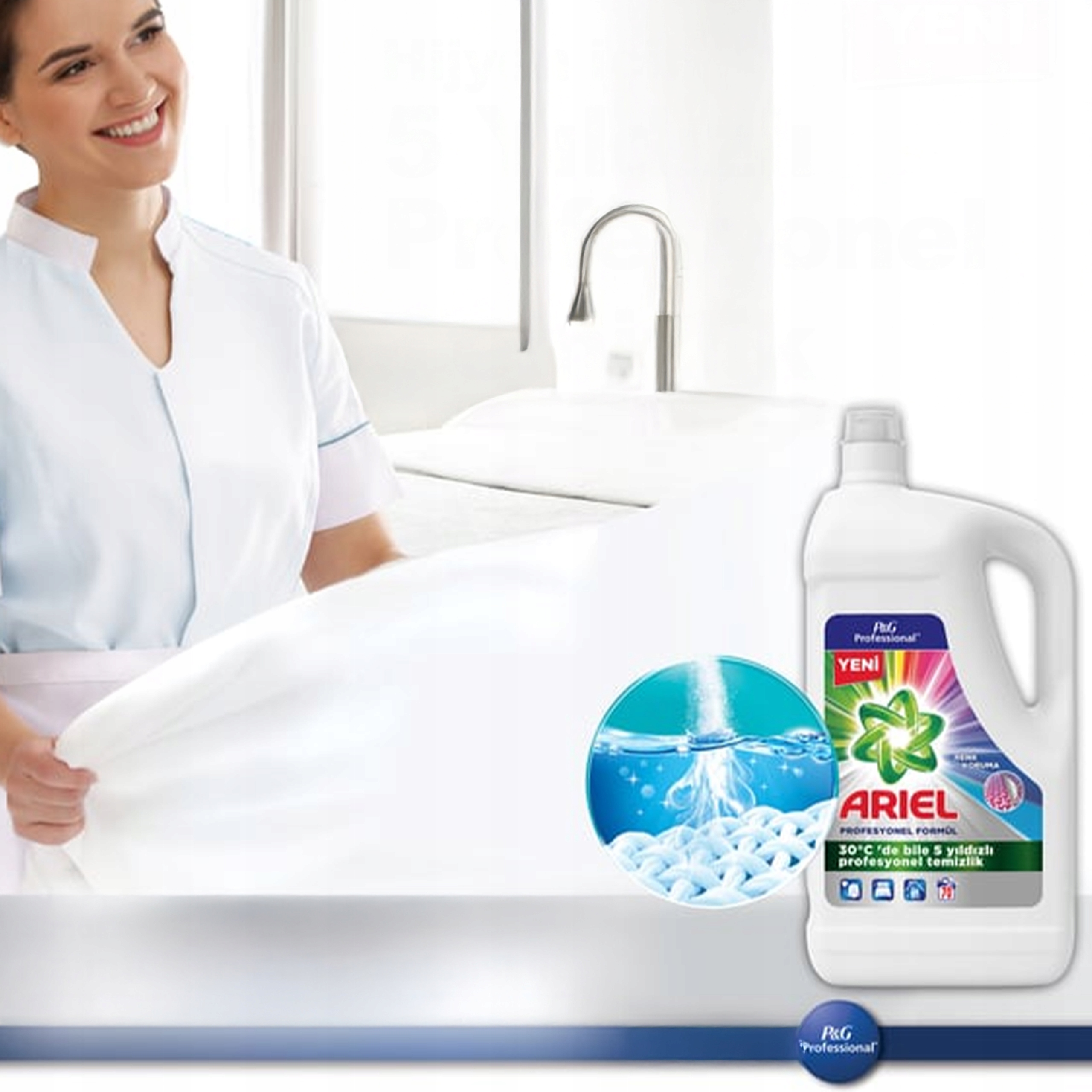 Z Ariel Professional Color Twoje kolorowe ubrania i tekstylia w obiektach HoReCa pozostaną żywe, pachnące i perfekcyjnie czyste – niezależnie od tego, ile razy je pierzesz.